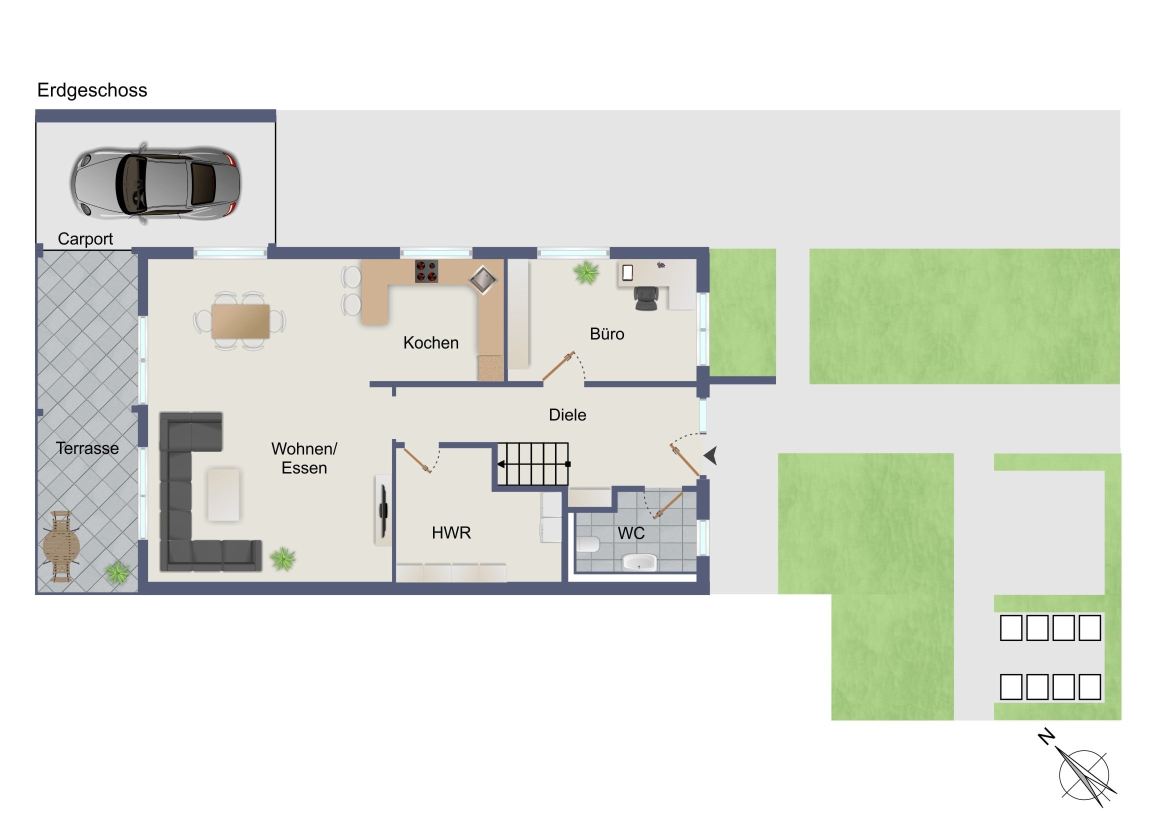 Im Erdgeschoss befinden sich zudem ein Gäste-WC, ein Haustechnikraum sowie ein Zimmer. Das angebaute Carport mit Anschluss für eine PKW-Wallbox ist auch bequem über die Terrasse erreichbar.