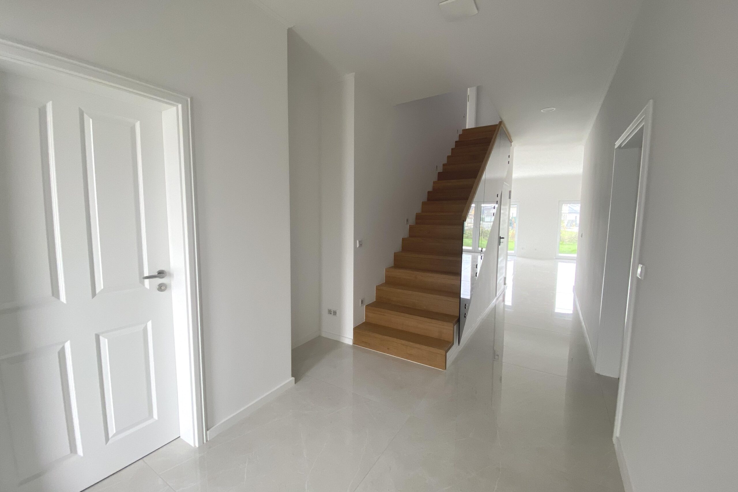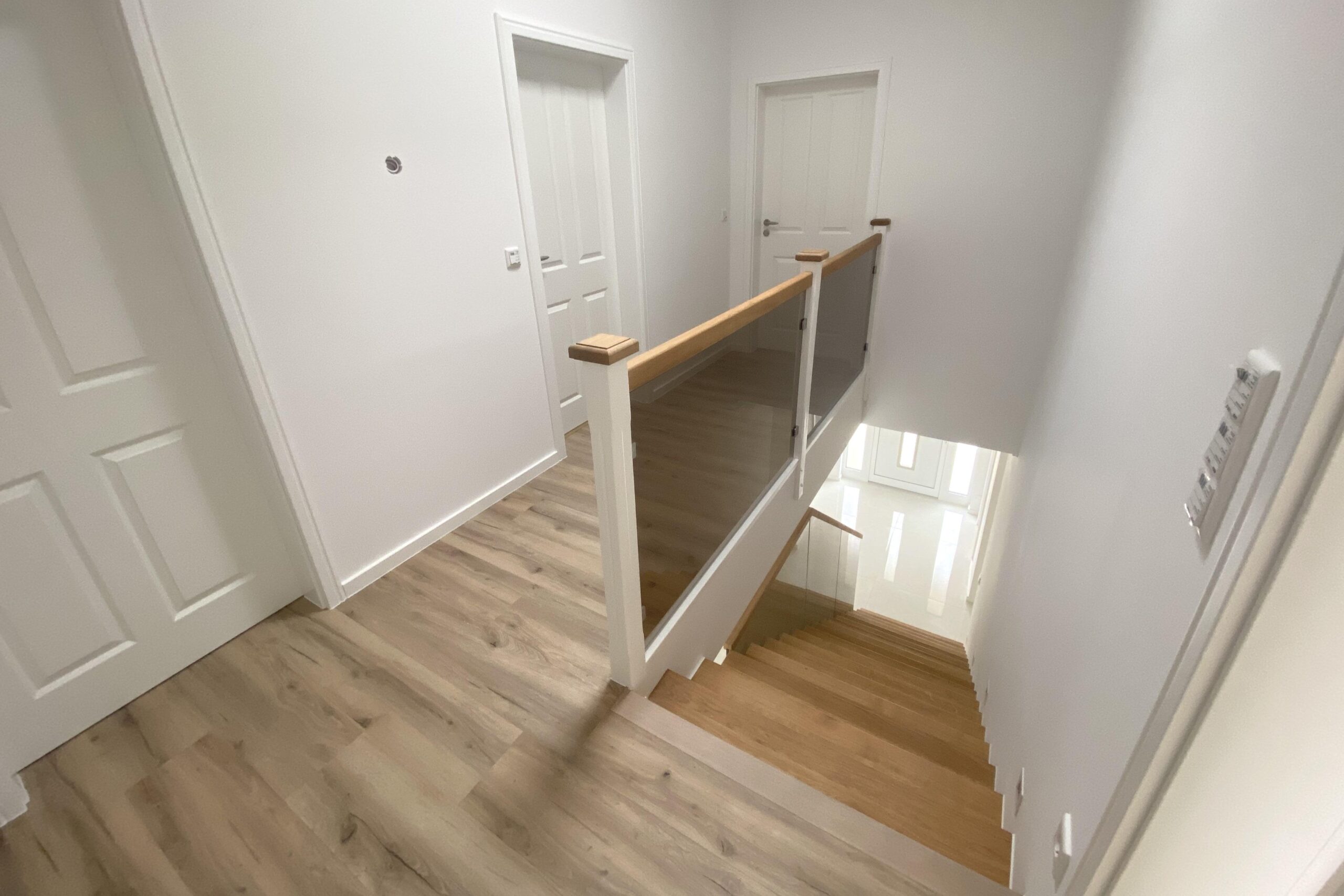In das Obergeschoss gelangen Sie über die massive Holztreppe mit Oberlicht. Die weißen Wände und die warme Holztreppe schaffen eine wunderschöne Tageslichtatmosphäre. Im Obergeschoss befinden sich insgesamt drei Schlafzimmer und zwei Badezimmer. Das Elternschlafzimmer verfügt über ein eigenes Bad en Suite mit Dusche und Badewanne sowie eine Ankleide.