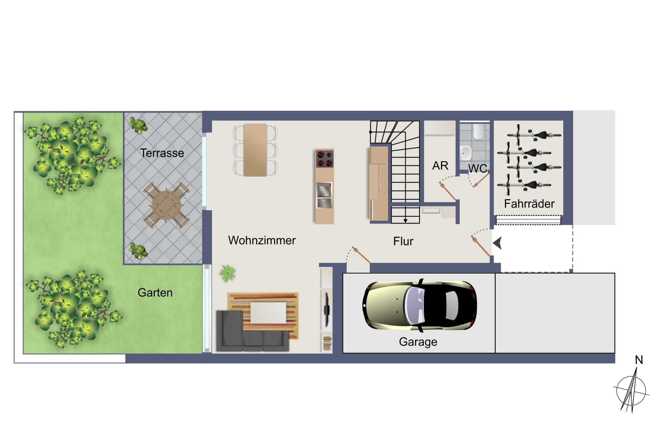 Im Erdgeschoss befinden sich zudem ein Gäste-WC, ein Haustechnikraum sowie ein Abstellraum. Die integrierte Garage mit Anschluss für eine PKW-Ladestation ist bequem vom Flur aus erreichbar.