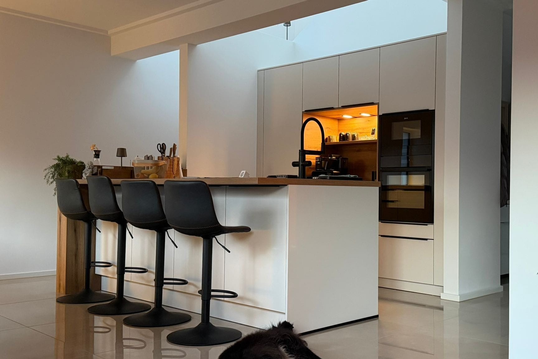 Beim Betreten des Hauses erwartet Sie ein heller Flur, der Sie direkt in den geschmackvoll gestalteten Wohn- und Essbereich führt. Der gesamte Bereich ist mit wunderschönen, cremefarbenen Steinfliesen ausgestattet. Die bodentiefen Fenster sorgen für eine angenehme Helligkeit und bieten einen traumhaften Ausblick auf die Terrasse und den Garten. Die Küche hat genügend Platz für eine Kochinsel und verfügt über vorinstallierte Anschlüsse sowie eine galerieartige Öffnung in das Obergeschoss.