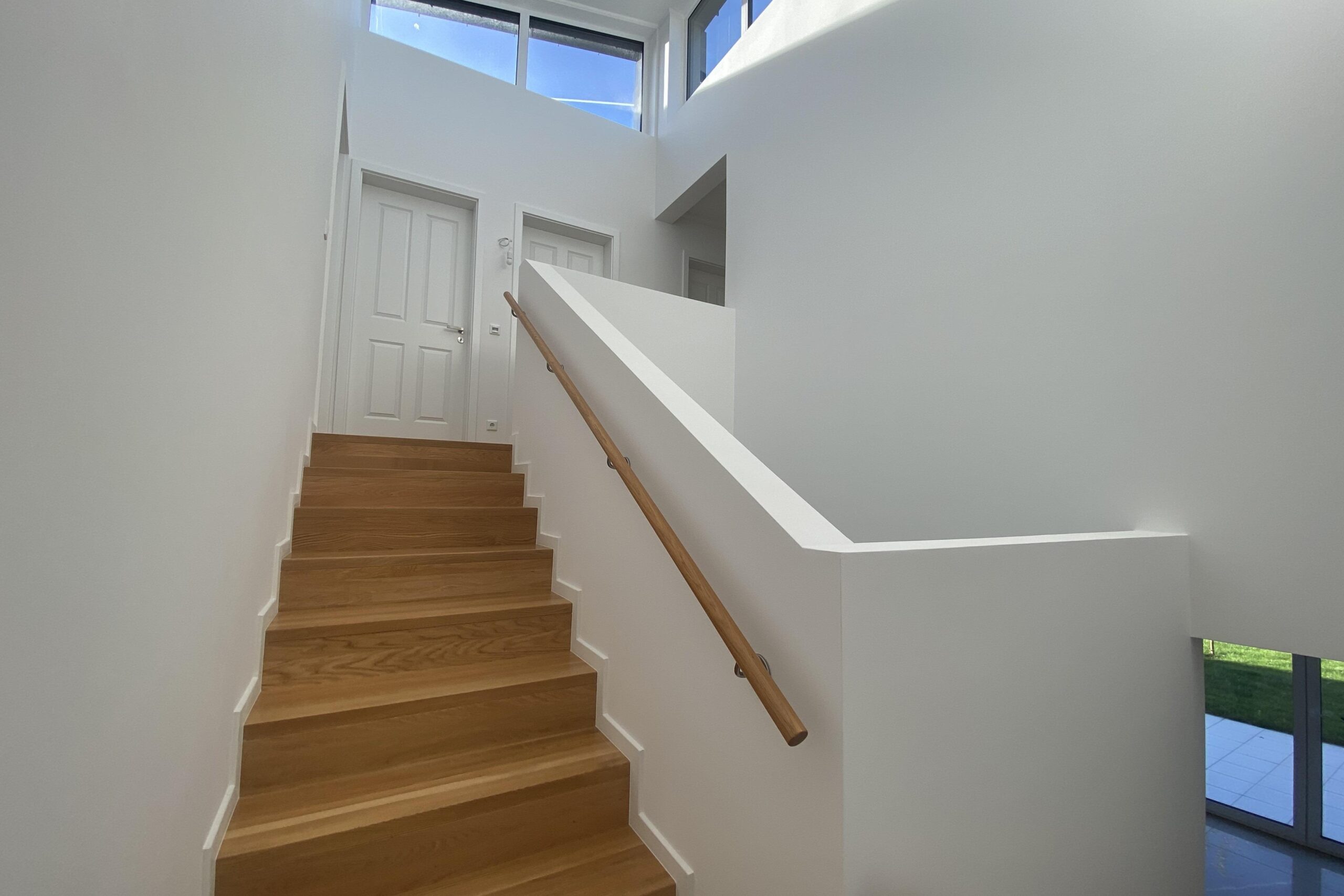 In das Obergeschoss gelangen Sie über die massive Holztreppe in die helle Galerie mit Oberlicht. Die weißen Wände und die warme Holztreppe schaffen eine wunderschöne Tageslichtatmosphäre. Im Obergeschoss befinden sich insgesamt drei Schlafzimmer, zwei Badezimmer und ein Abstellraum. Das Elternschlafzimmer verfügt über ein eigenes Bad en Suite mit Dusche und Badewanne.